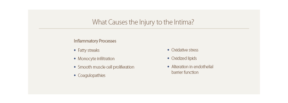 Today, several inflammatory processes have been linked to injury to the intima, the inner membrane of an artery, including monocyte infiltration, oxidative stress, and smooth muscle cell proliferation.