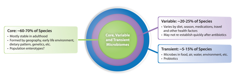 What this and other data seem to reveal is that while a core microbiome (structure and species) is part of development, and is formed as part of an individual’s early inoculation and environmental exposure, subtle and important changes in the variable commensal microbiome can occur without fundamentally altering the long-term stability of the core species (at least as determined by analysis of fecal microbiota). This means differences in fecal microbiota (beyond the core species enumeration and ratio) may reflect adaptations to environmental or pathophysiological changes that can be meaningfully followed in clinical research or in clinical application. Lastly, there is also a significant portion of the microbiota that is transient; most comes from our food (including probiotics), water, air, and environment. These microorganisms rarely persist beyond a week or two, but they can be important modulators of both the core and variable microbiome, and greatly influence host physiology.