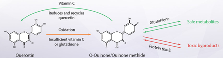 As a potent bioflavonoid, quercetin supports the immune system in a dose-dependent manner. But when delivered by itself, without the addition of select antioxidants, quercetin can quickly oxidize. Oxidized quercetin forms quinones. In the presence of protein thiol groups, these quercetin-quinones will form toxic compounds that go on to exert pro-oxidant effects and cause damage throughout the body.
